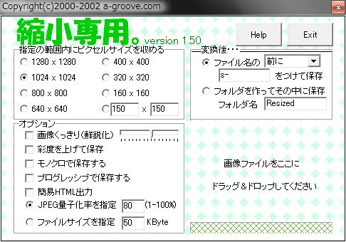 このソフトは、デスクトップ上に生成されたアイコンに、縮小したい写真ファイルをドラッグアンドドロップするだけ(複数ファイル、フォルダ単位でも可能)で設定通りに一括で縮小してくれます。また、縮小方法やファイル名などの設定も簡単に行うことができます。
