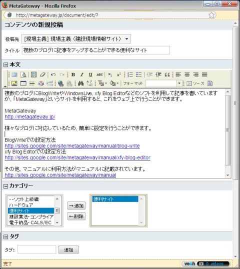 複数のブログにBlogWriteやWindows Live Writer、xfy Blog Editorなどのソフトを利用して記事を書いていますが、Googleから提供されている「MetaGateway」というサイトを利用すると、これをウェブ上で行うことができます。
