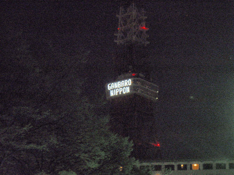 ライトアップ自粛中の東京タワーで太陽光を用いたLEDライトで展望台に表示されている「がんばろう日本」。表示されているのは、海側の展望台側面。