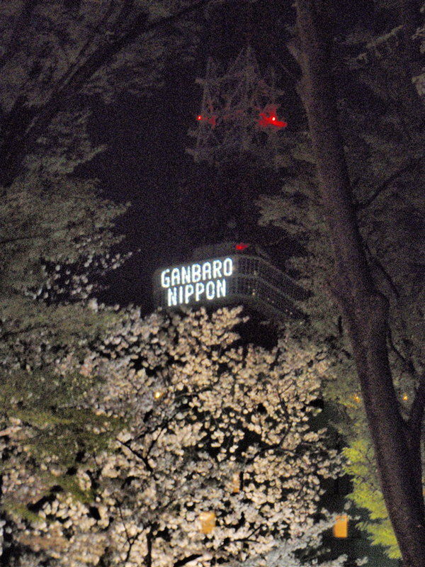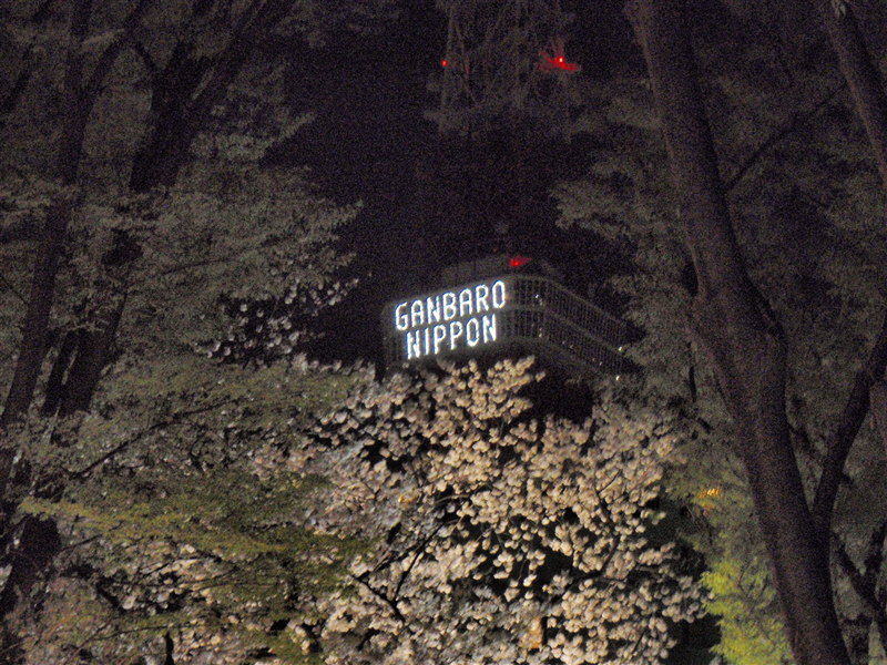 こちらは東京プリンスホテル桜まつりでライトアップされた満開の桜と「がんばろう日本」。