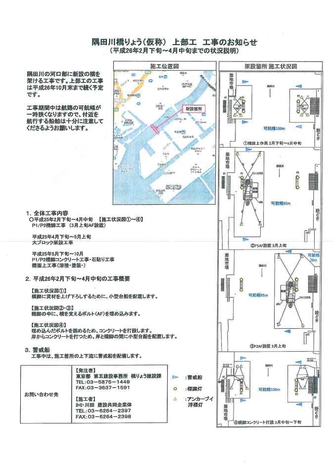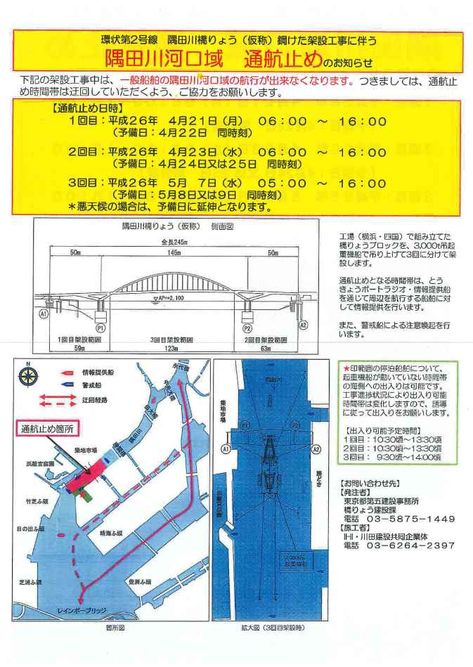 こちらの「隅田川河口域通航止め」案内によると、隅田川橋りょうは3つに分けて架設されるようです。