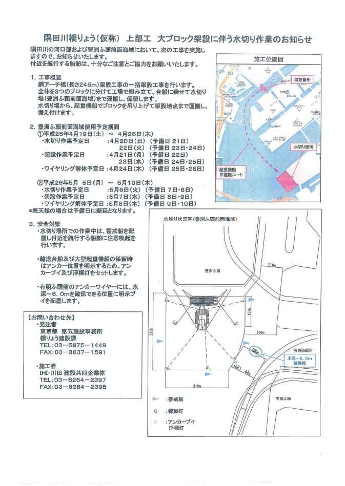 水切り作業(起重機船への吊上げ)は、豊洲の海側で行われ、そこから架設場所まで吊ったまま移動するようです。