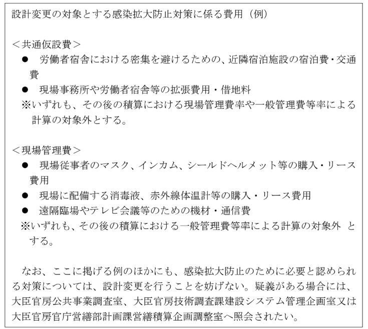なお、ここに掲げる例のほかにも、感染拡大防止のために必要と認められる対策については、設計変更を行うことを妨げない。