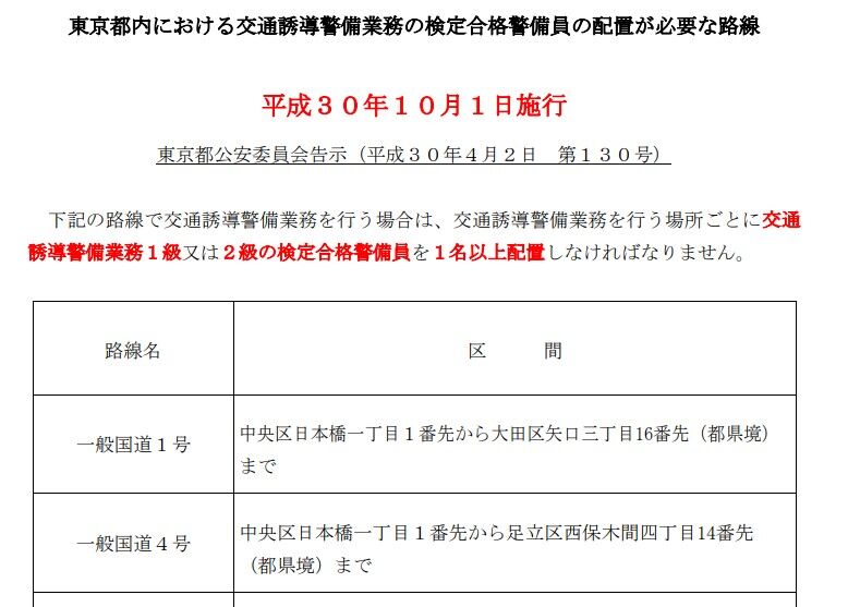 東京都内における交通誘導警備業務の検定合格警備員の配置が必要な路線