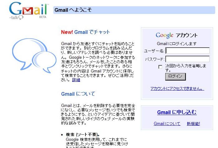 Google のサービスの一つでもある Web メールサービス「Gmail」(2.7Gバイト)が、8月23日付けで登録制になりました。いままでは招待状がないと利用できませんでした。というわけで、早速登録しました。★GmailのトップページWeb メールサービスは初めて利用するのでまだ機...