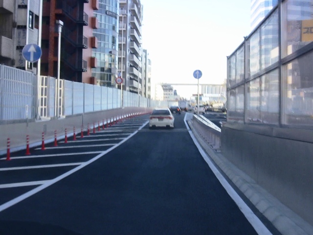 西新宿JCTの様子です。分岐した後は左カーブになりますが、完成している右側(大橋JCT方面)は2年後の開通となります。