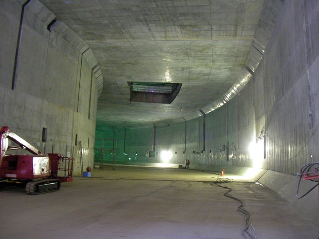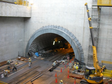 大橋シールドは延長431.7mで、松見坂立坑を発進し上段(内回り)トンネルを掘削した後、大橋立坑で、下段への移動と180度回転をして、再度松見坂立坑へ下段(外回り)トンネルを掘削するものだそうです。現在は、上段トンネルを掘削完了し、下段の発進準備を行っているところでした。