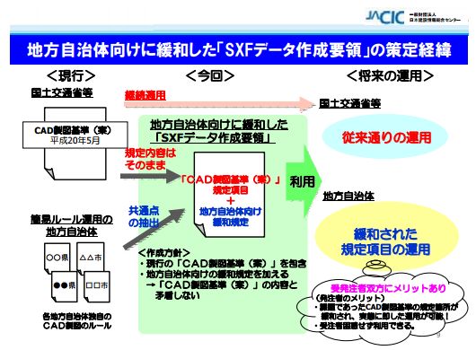 「地方自治体がCAD製図基準を緩和して適用する際に参考となる「SXFデータ作成要領」を策定し、社会基盤情報標準化委員会において決定された」とあります。